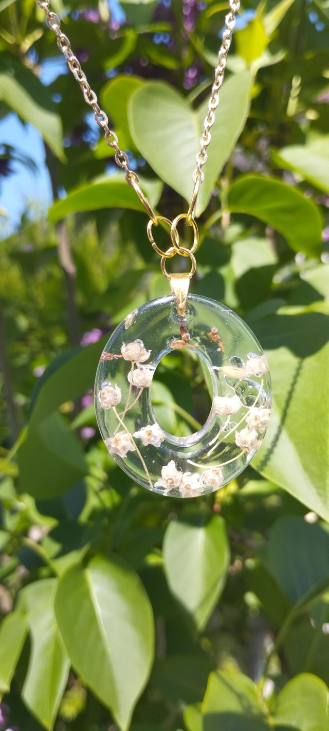 Anneau épais en résine translucide, où dansent des fleurs d’allium séchées, petites étoiles assemblées en sphère parfaite. La chaîne argentée est ornée d’anneaux dorés qui diffusent chaleur et éclat.