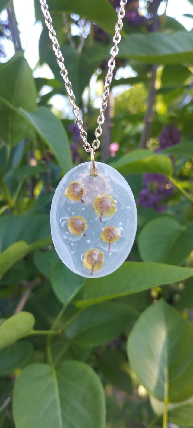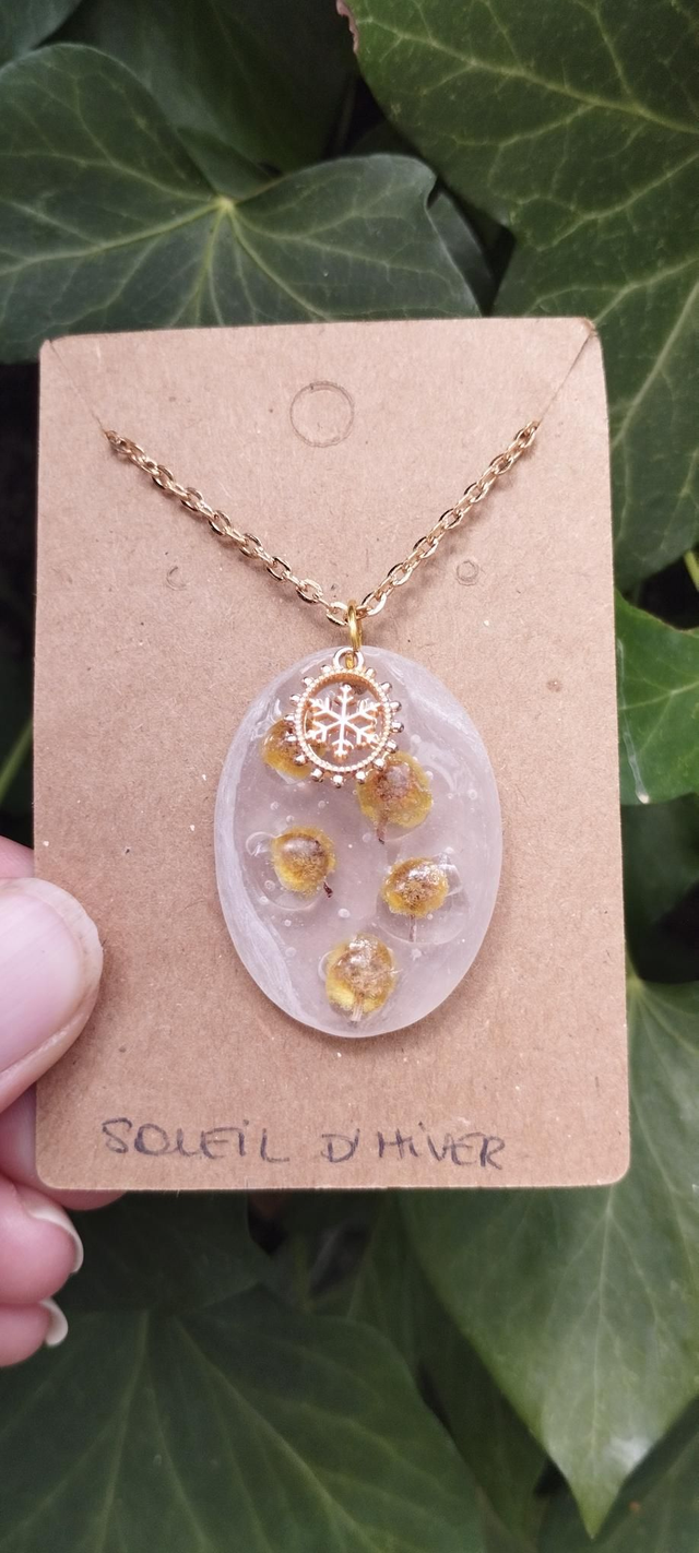 Dans un ovale de résine poncée comme un voile de gel, cinq fleurs de mimosa s’épanouissent telles des soleils d’hiver, porteurs de lumière au cœur de l’ombre. La breloque flocon de neige, posée autour de la chaîne, évoque la magie des cycles et le renouveau.