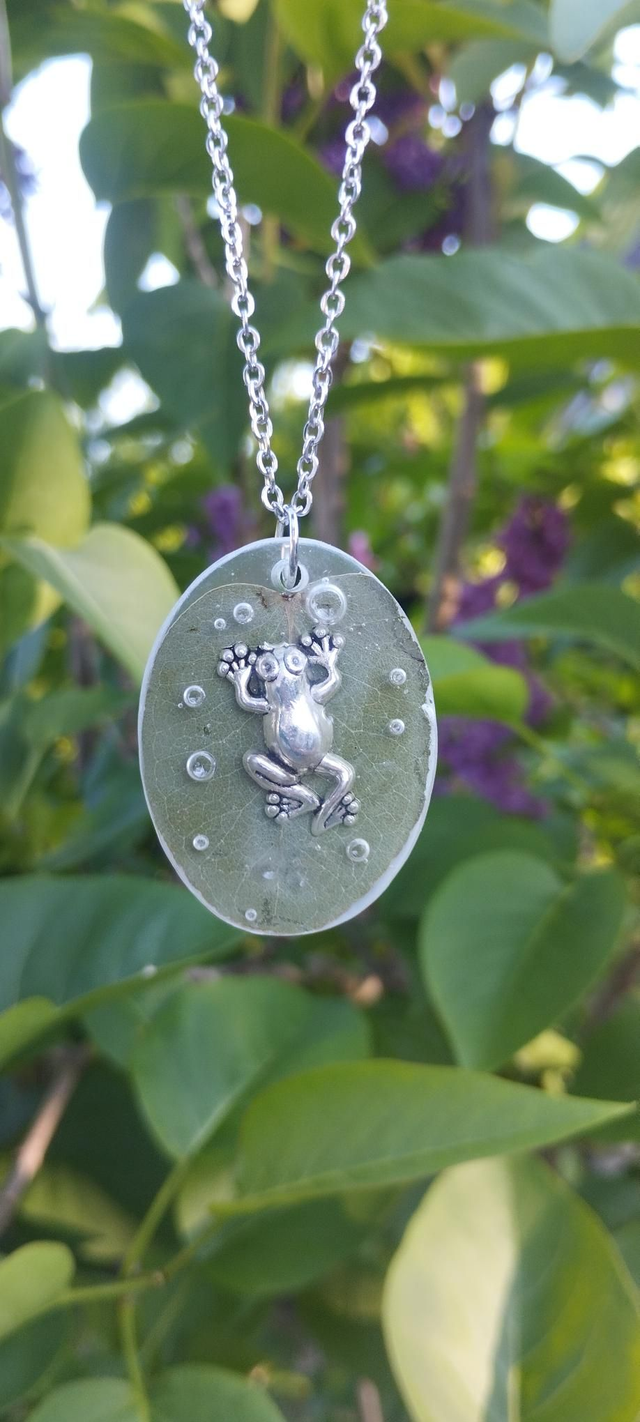 Dans un ovale de résine, une feuille d’eucalyptus forme un lit végétal. Une grenouille en relief y repose, comme sur un nénuphar. Des bulles d’air flottent, ajoutant une touche onirique.